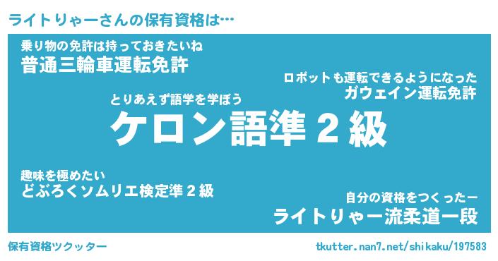 ライトりゃーさんの保有資格は… とりあえず語学を学ぼう『ケロン語準2級』乗り物の免許は持っておきたいね『普通三輪車運転免許』自分の資格をつくったー『ライトりゃー流柔道一段』 ツクッター #保有資格ツクッター http://tkutter.nan7.net/shikaku/197583/