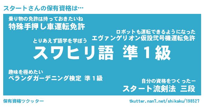 スタートさんの保有資格は… とりあえず語学を学ぼう『スワヒリ語 準1級』乗り物の免許は持っておきたいね『特殊手押し車運転免許』自分の資格をつくったー『スタート流剣法 三段』 ツクッター #保有資格ツクッター http://tkutter.nan7.net/shikaku/198527/