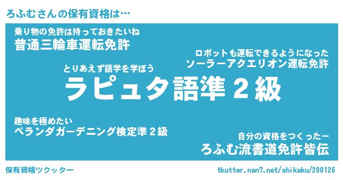 ろふむさんの保有資格は… とりあえず語学を学ぼう『ラピュタ語準2級』乗り物の免許は持っておきたいね『普通三輪車運転免許』自分の資格をつくったー『ろふむ流書道免許皆伝』 ツクッター #保有資格ツクッター http://tkutter.nan7.net/shikaku/200126/