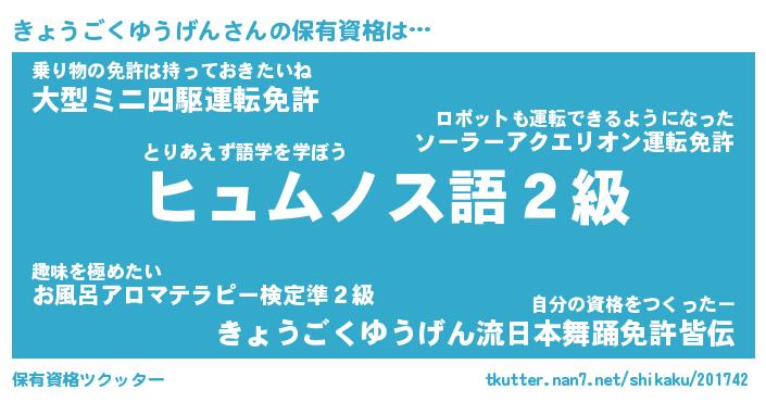 きょうごくゆうげんさんの保有資格は… とりあえず語学を学ぼう『ヒュムノス語2級』乗り物の免許は持っておきたいね『大型ミニ四駆運転免許』自分の資格をつくったー『きょうごくゆうげん流日本舞踊免許皆伝』 ツクッター #保有資格ツクッター http://tkutter.nan7.net/shikaku/201742/