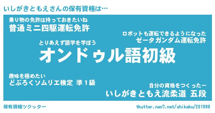 | 肩書あだ名 | 『いしがきともえ御曹司』 |