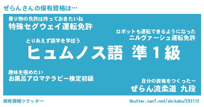 ぜらんさんの保有資格は… とりあえず語学を学ぼう『ヒュムノス語 準1級』乗り物の免許は持っておきたいね『特殊セグウェイ運転免許』自分の資格をつくったー『ぜらん流柔道 九段』 ツクッター #保有資格ツクッター http://tkutter.nan7.net/shikaku/203112/