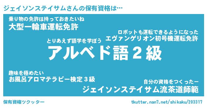| 欧米人風あだ名 | 『マイケルジェイソンステイサム』 |