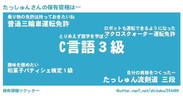 たっしゅんさんの保有資格は… とりあえず語学を学ぼう『C言語3級』乗り物の免許は持っておきたいね『普通三輪車運転免許』自分の資格をつくったー『たっしゅん流剣道 三段』 ツクッター #保有資格ツクッター http://tkutter.nan7.net/shikaku/204489/