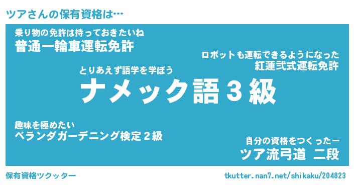 ツアさんの保有資格は… とりあえず語学を学ぼう『ナメック語3級』乗り物の免許は持っておきたいね『普通一輪車運転免許』自分の資格をつくったー『ツア流弓道 二段』 ツクッター #保有資格ツクッター http://tkutter.nan7.net/shikaku/204823/