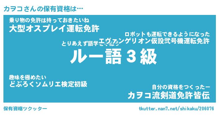 カヲコさんの保有資格は… とりあえず語学を学ぼう『 ルー語3級』乗り物の免許は持っておきたいね『大型オスプレイ運転免許』自分の資格をつくったー『カヲコ流剣道免許皆伝』 ツクッター #保有資格ツクッター http://tkutter.nan7.net/shikaku/206076/