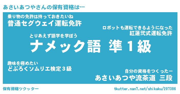 あさいあつやさんの保有資格は… とりあえず語学を学ぼう『ナメック語 準1級』乗り物の免許は持っておきたいね『普通セグウェイ運転免許』自分の資格をつくったー『あさいあつや流茶道 三段』 ツクッター #保有資格ツクッター http://tkutter.nan7.net/shikaku/207386/