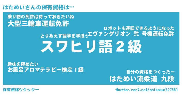 はためいさんの保有資格は… とりあえず語学を学ぼう『スワヒリ語2級』乗り物の免許は持っておきたいね『大型三輪車運転免許』自分の資格をつくったー『はためい流柔道 九段』 ツクッター #保有資格ツクッター http://tkutter.nan7.net/shikaku/207551/
