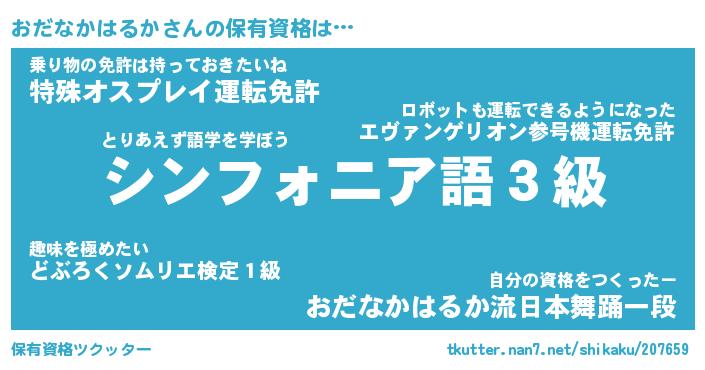 おだなかはるかさんの保有資格は… とりあえず語学を学ぼう『シンフォニア語3級』乗り物の免許は持っておきたいね『特殊オスプレイ運転免許』自分の資格をつくったー『おだなかはるか流日本舞踊一段』 ツクッター #保有資格ツクッター http://tkutter.nan7.net/shikaku/207659/