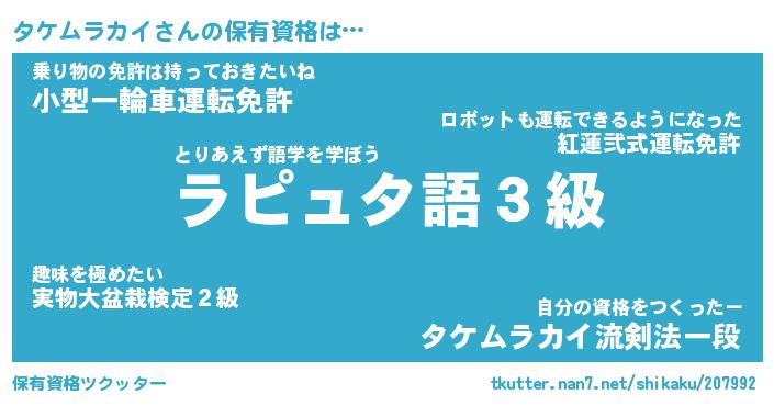 タケムラカイさんの保有資格は… とりあえず語学を学ぼう『ラピュタ語3級』乗り物の免許は持っておきたいね『小型一輪車運転免許』自分の資格をつくったー『タケムラカイ流剣法一段』 ツクッター #保有資格ツクッター http://tkutter.nan7.net/shikaku/207992/
