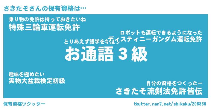 さきたそさんの保有資格は… とりあえず語学を学ぼう『お通語3級』乗り物の免許は持っておきたいね『特殊三輪車運転免許』自分の資格をつくったー『さきたそ流剣法免許皆伝』 ツクッター #保有資格ツクッター http://tkutter.nan7.net/shikaku/208866/