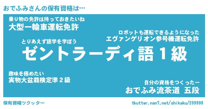 おでふみさんの保有資格は… とりあえず語学を学ぼう『ゼントラーディ語1級』乗り物の免許は持っておきたいね『大型一輪車運転免許』自分の資格をつくったー『おでふみ流茶道 五段』 ツクッター #保有資格ツクッター http://tkutter.nan7.net/shikaku/209998/