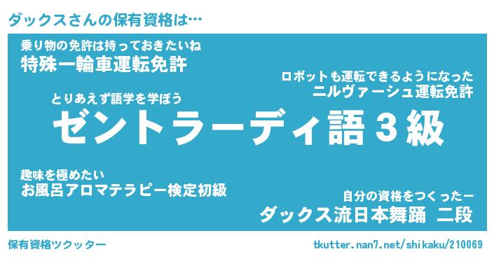 ダックスさんの保有資格は… とりあえず語学を学ぼう『ゼントラーディ語3級』乗り物の免許は持っておきたいね『特殊一輪車運転免許』自分の資格をつくったー『ダックス流日本舞踊 二段』 ツクッター #保有資格ツクッター http://tkutter.nan7.net/shikaku/210069/