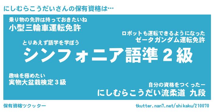 | 男性向けラノベタイトル風あだ名 | 『にしむらこうだいの憂鬱』 |