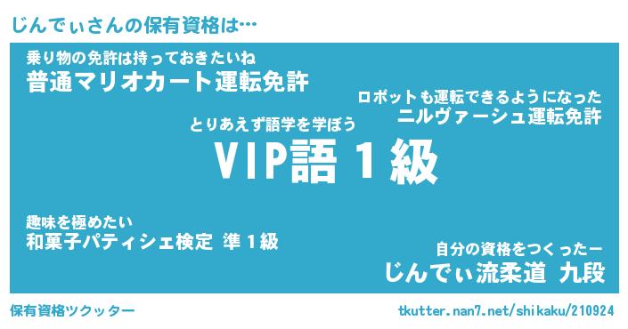 じんでぃさんの保有資格は… とりあえず語学を学ぼう『 VIP語1級』乗り物の免許は持っておきたいね『普通マリオカート運転免許』自分の資格をつくったー『じんでぃ流柔道 九段』 ツクッター #保有資格ツクッター http://tkutter.nan7.net/shikaku/210924/