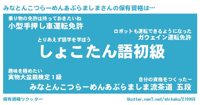 | 欧米人風あだ名 | 『マイケルみなとんこつらーめんあぶらましま』 |