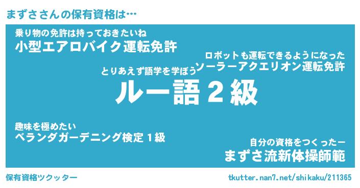 まずささんの保有資格は… とりあえず語学を学ぼう『 ルー語2級』乗り物の免許は持っておきたいね『小型エアロバイク運転免許』自分の資格をつくったー『まずさ流新体操師範』 ツクッター #保有資格ツクッター http://tkutter.nan7.net/shikaku/211365/