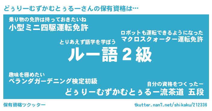 どぅりーむずかむとぅるーさんの保有資格は… とりあえず語学を学ぼう『 ルー語2級』乗り物の免許は持っておきたいね『小型ミニ四駆運転免許』自分の資格をつくったー『どぅりーむずかむとぅるー流茶道 五段』 ツクッター #保有資格ツクッター http://tkutter.nan7.net/shikaku/212336/