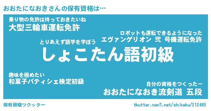 おおたになおきさんの保有資格は… とりあえず語学を学ぼう『しょこたん語初級』乗り物の免許は持っておきたいね『大型三輪車運転免許』自分の資格をつくったー『おおたになおき流剣道 五段』 ツクッター #保有資格ツクッター http://tkutter.nan7.net/shikaku/212485/