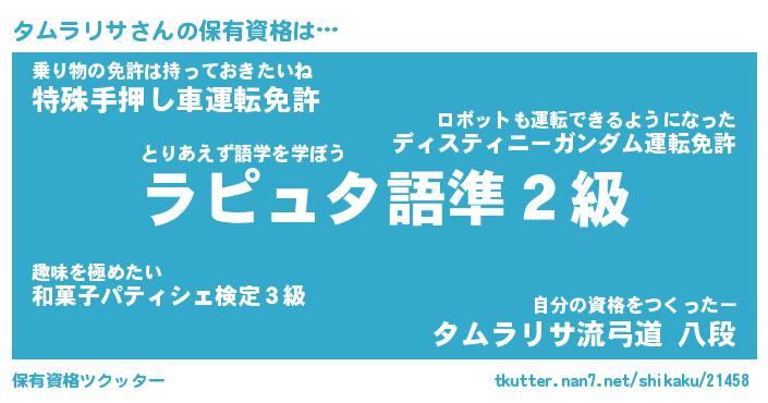 タムラリサさんの保有資格は… とりあえず語学を学ぼう『ラピュタ語準2級』乗り物の免許は持っておきたいね『特殊手押し車運転免許』自分の資格をつくったー『タムラリサ流弓道 八段』 ツクッター #保有資格ツクッター http://tkutter.nan7.net/shikaku/21458/