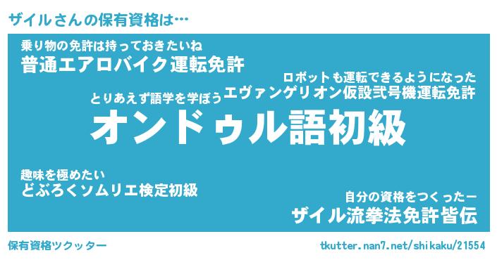 ザイルさんの保有資格は… とりあえず語学を学ぼう『オンドゥル語初級』乗り物の免許は持っておきたいね『普通エアロバイク運転免許』自分の資格をつくったー『ザイル流拳法免許皆伝』 ツクッター #保有資格ツクッター http://tkutter.nan7.net/shikaku/21554/