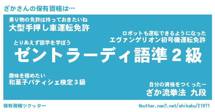 ざかさんの保有資格は… とりあえず語学を学ぼう『ゼントラーディ語準2級』乗り物の免許は持っておきたいね『大型手押し車運転免許』自分の資格をつくったー『ざか流拳法 九段』 ツクッター #保有資格ツクッター http://tkutter.nan7.net/shikaku/21971/
