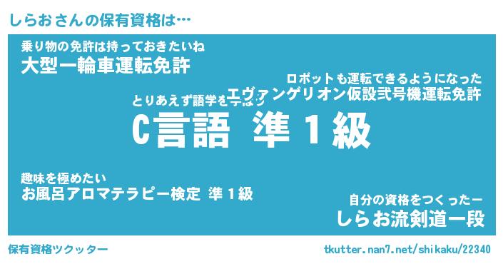 しらおさんの保有資格は… とりあえず語学を学ぼう『C言語 準1級』乗り物の免許は持っておきたいね『大型一輪車運転免許』自分の資格をつくったー『しらお流剣道一段』 ツクッター #保有資格ツクッター http://tkutter.nan7.net/shikaku/22340/