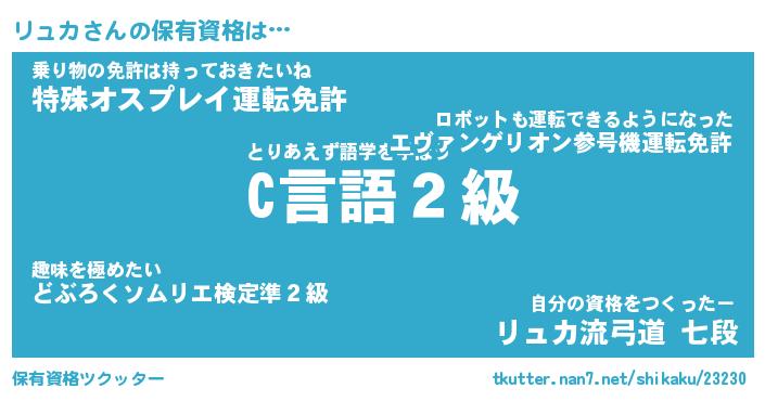 リュカさんの保有資格は… とりあえず語学を学ぼう『C言語2級』乗り物の免許は持っておきたいね『特殊オスプレイ運転免許』自分の資格をつくったー『リュカ流弓道 七段』 ツクッター #保有資格ツクッター http://tkutter.nan7.net/shikaku/23230/