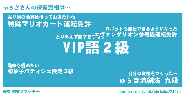 ゅぅきさんの保有資格は… とりあえず語学を学ぼう『 VIP語2級』乗り物の免許は持っておきたいね『特殊マリオカート運転免許』自分の資格をつくったー『ゅぅき流剣法 九段』 ツクッター #保有資格ツクッター http://tkutter.nan7.net/shikaku/24076/