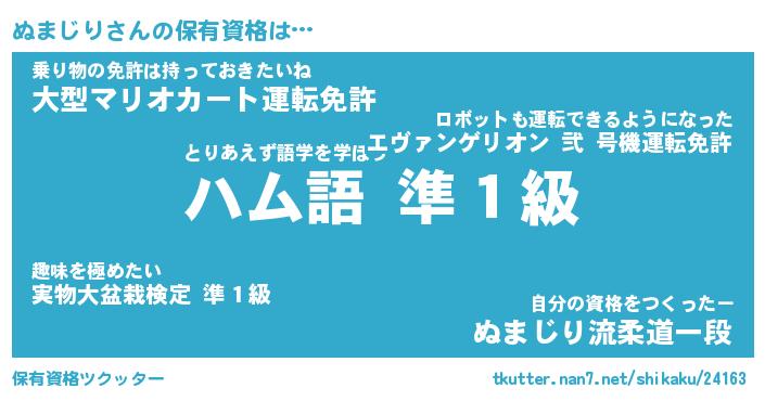 ぬまじりさんの保有資格は… とりあえず語学を学ぼう『ハム語 準1級』乗り物の免許は持っておきたいね『大型マリオカート運転免許』自分の資格をつくったー『ぬまじり流柔道一段』 ツクッター #保有資格ツクッター http://tkutter.nan7.net/shikaku/24163/