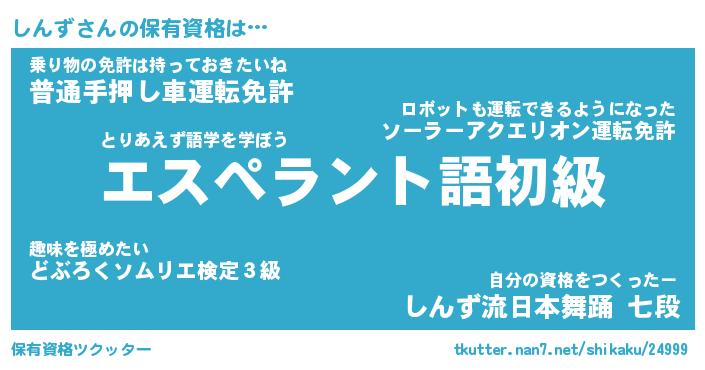 しんずさんの保有資格は… とりあえず語学を学ぼう『エスペラント語初級』乗り物の免許は持っておきたいね『普通手押し車運転免許』自分の資格をつくったー『しんず流日本舞踊 七段』 ツクッター #保有資格ツクッター http://tkutter.nan7.net/shikaku/24999/