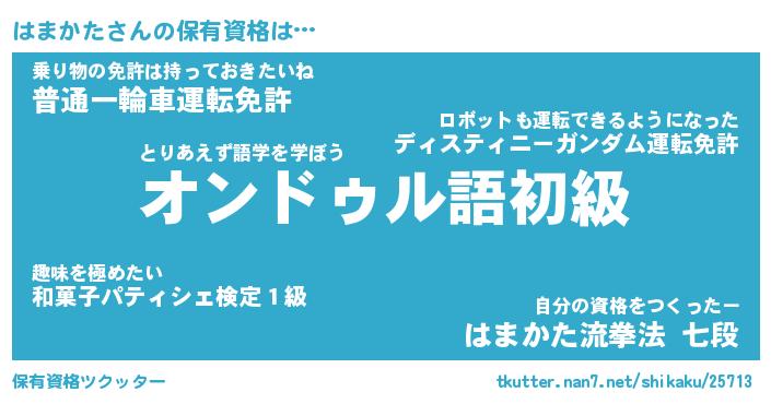 はまかたさんの保有資格は… とりあえず語学を学ぼう『オンドゥル語初級』乗り物の免許は持っておきたいね『普通一輪車運転免許』自分の資格をつくったー『はまかた流拳法 七段』 ツクッター #保有資格ツクッター http://tkutter.nan7.net/shikaku/25713/