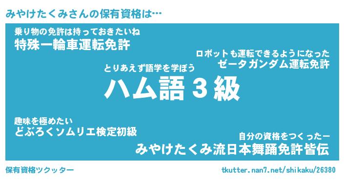 | 肩書あだ名 | 『みやけたくみ店長』『みやけたくみ団長』 |
