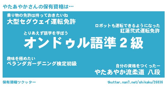 やたあやかさんの保有資格は… とりあえず語学を学ぼう『オンドゥル語準2級』乗り物の免許は持っておきたいね『大型セグウェイ運転免許』自分の資格をつくったー『やたあやか流柔道 八段』 ツクッター #保有資格ツクッター http://tkutter.nan7.net/shikaku/26836/
