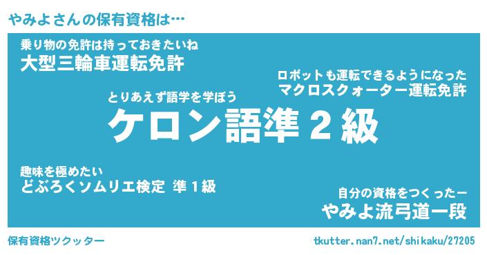 やみよさんの保有資格は… とりあえず語学を学ぼう『ケロン語準2級』乗り物の免許は持っておきたいね『大型三輪車運転免許』自分の資格をつくったー『やみよ流弓道一段』 ツクッター #保有資格ツクッター http://tkutter.nan7.net/shikaku/27205/
