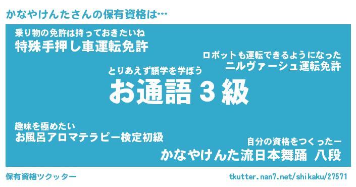 かなやけんたさんの保有資格は… とりあえず語学を学ぼう『お通語3級』乗り物の免許は持っておきたいね『特殊手押し車運転免許』自分の資格をつくったー『かなやけんた流日本舞踊 八段』 ツクッター #保有資格ツクッター http://tkutter.nan7.net/shikaku/27571/