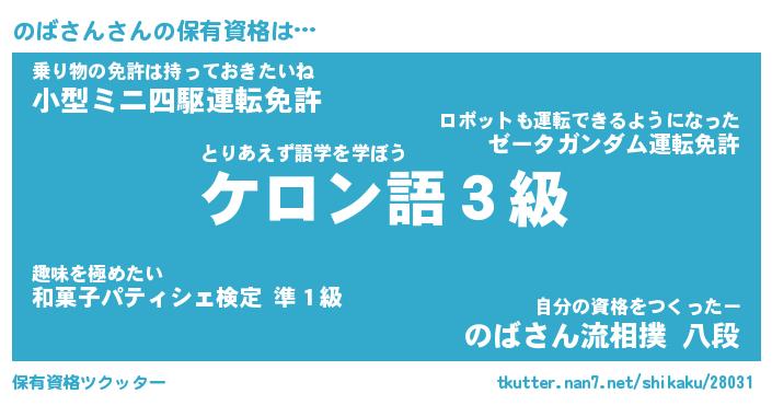 のばさんさんの保有資格は… とりあえず語学を学ぼう『ケロン語3級』乗り物の免許は持っておきたいね『小型ミニ四駆運転免許』自分の資格をつくったー『のばさん流相撲 八段』 ツクッター #保有資格ツクッター http://tkutter.nan7.net/shikaku/28031/