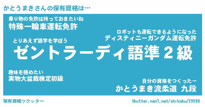 かとうまきさんの保有資格は… とりあえず語学を学ぼう『ゼントラーディ語準2級』乗り物の免許は持っておきたいね『特殊一輪車運転免許』自分の資格をつくったー『かとうまき流柔道 九段』 ツクッター #保有資格ツクッター http://tkutter.nan7.net/shikaku/29586/