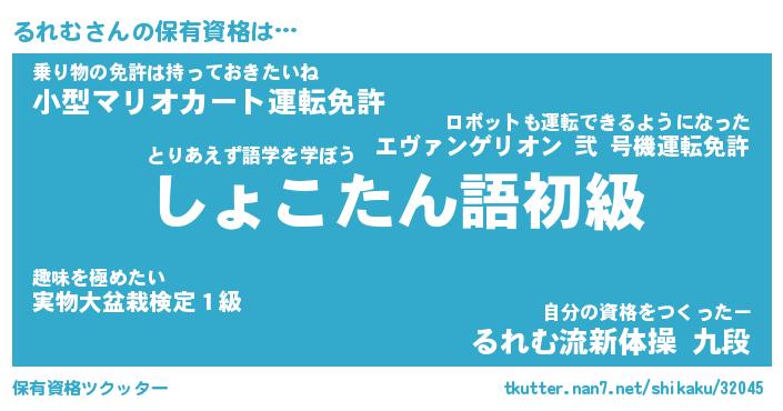 るれむさんの保有資格は… とりあえず語学を学ぼう『しょこたん語初級』乗り物の免許は持っておきたいね『小型マリオカート運転免許』自分の資格をつくったー『るれむ流新体操 九段』 ツクッター #保有資格ツクッター http://tkutter.nan7.net/shikaku/32045/