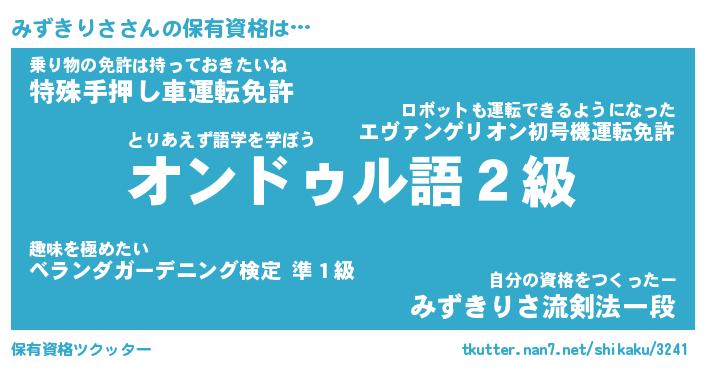 みずきりささんの保有資格は… とりあえず語学を学ぼう『オンドゥル語2級』乗り物の免許は持っておきたいね『特殊手押し車運転免許』自分の資格をつくったー『みずきりさ流剣法一段』 ツクッター #保有資格ツクッター http://tkutter.nan7.net/shikaku/3241/