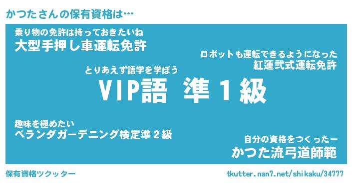 かつたさんの保有資格は… とりあえず語学を学ぼう『 VIP語 準1級』乗り物の免許は持っておきたいね『大型手押し車運転免許』自分の資格をつくったー『かつた流弓道師範』 ツクッター #保有資格ツクッター http://tkutter.nan7.net/shikaku/34777/