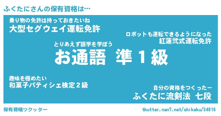 ふくたにさんの保有資格は… とりあえず語学を学ぼう『お通語 準1級』乗り物の免許は持っておきたいね『大型セグウェイ運転免許』自分の資格をつくったー『ふくたに流剣法 七段』 ツクッター #保有資格ツクッター http://tkutter.nan7.net/shikaku/34816/