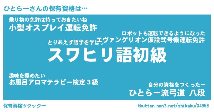 ひとらーさんの保有資格は… とりあえず語学を学ぼう『スワヒリ語初級』乗り物の免許は持っておきたいね『小型オスプレイ運転免許』自分の資格をつくったー『ひとらー流弓道 八段』 ツクッター #保有資格ツクッター http://tkutter.nan7.net/shikaku/34956/