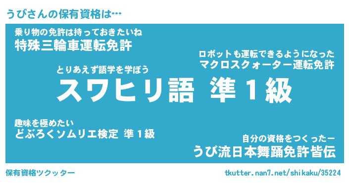 うびさんの保有資格は… とりあえず語学を学ぼう『スワヒリ語 準1級』乗り物の免許は持っておきたいね『特殊三輪車運転免許』自分の資格をつくったー『うび流日本舞踊免許皆伝』 ツクッター #保有資格ツクッター http://tkutter.nan7.net/shikaku/35224/