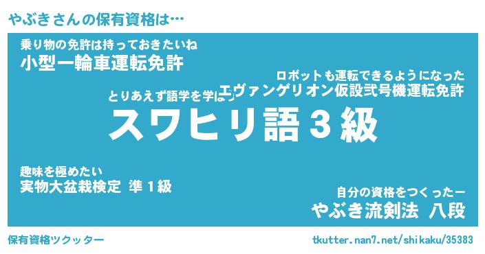 やぶきさんの保有資格は… とりあえず語学を学ぼう『スワヒリ語3級』乗り物の免許は持っておきたいね『小型一輪車運転免許』自分の資格をつくったー『やぶき流剣法 八段』 ツクッター #保有資格ツクッター http://tkutter.nan7.net/shikaku/35383/