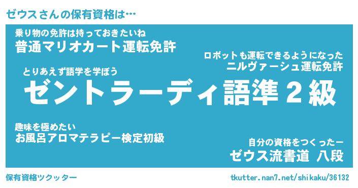 ゼウスさんの保有資格は… とりあえず語学を学ぼう『ゼントラーディ語準2級』乗り物の免許は持っておきたいね『普通マリオカート運転免許』自分の資格をつくったー『ゼウス流書道 八段』 ツクッター #保有資格ツクッター http://tkutter.nan7.net/shikaku/36132/