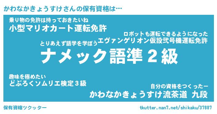 かわなかきょうすけさんの保有資格は… とりあえず語学を学ぼう『ナメック語準2級』乗り物の免許は持っておきたいね『小型マリオカート運転免許』自分の資格をつくったー『かわなかきょうすけ流茶道 九段』 ツクッター #保有資格ツクッター http://tkutter.nan7.net/shikaku/37887/
