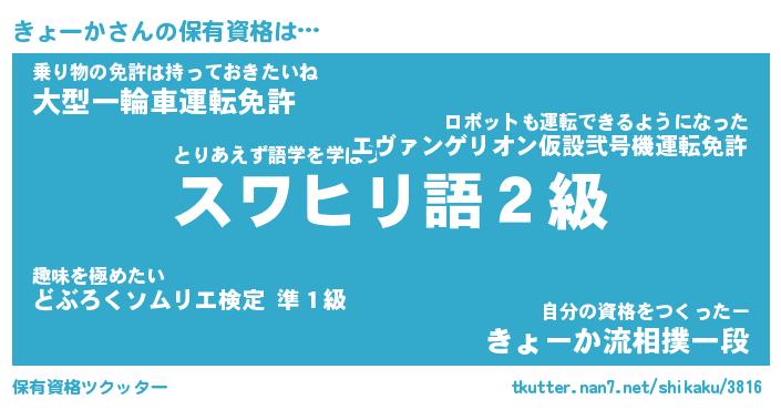 きょーかさんの保有資格は… とりあえず語学を学ぼう『スワヒリ語2級』乗り物の免許は持っておきたいね『大型一輪車運転免許』自分の資格をつくったー『きょーか流相撲一段』 ツクッター #保有資格ツクッター http://tkutter.nan7.net/shikaku/3816/
