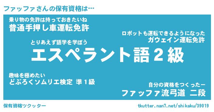 ファッファさんの保有資格は… とりあえず語学を学ぼう『エスペラント語2級』乗り物の免許は持っておきたいね『普通手押し車運転免許』自分の資格をつくったー『ファッファ流弓道 二段』 ツクッター #保有資格ツクッター http://tkutter.nan7.net/shikaku/39019/