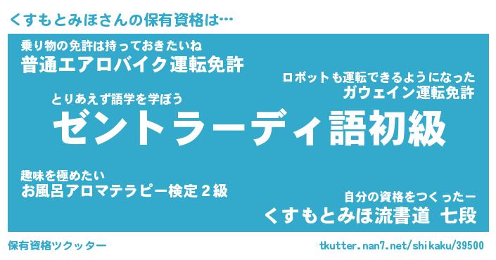 くすもとみほさんの保有資格は… とりあえず語学を学ぼう『ゼントラーディ語初級』乗り物の免許は持っておきたいね『普通エアロバイク運転免許』自分の資格をつくったー『くすもとみほ流書道 七段』 ツクッター #保有資格ツクッター http://tkutter.nan7.net/shikaku/39500/